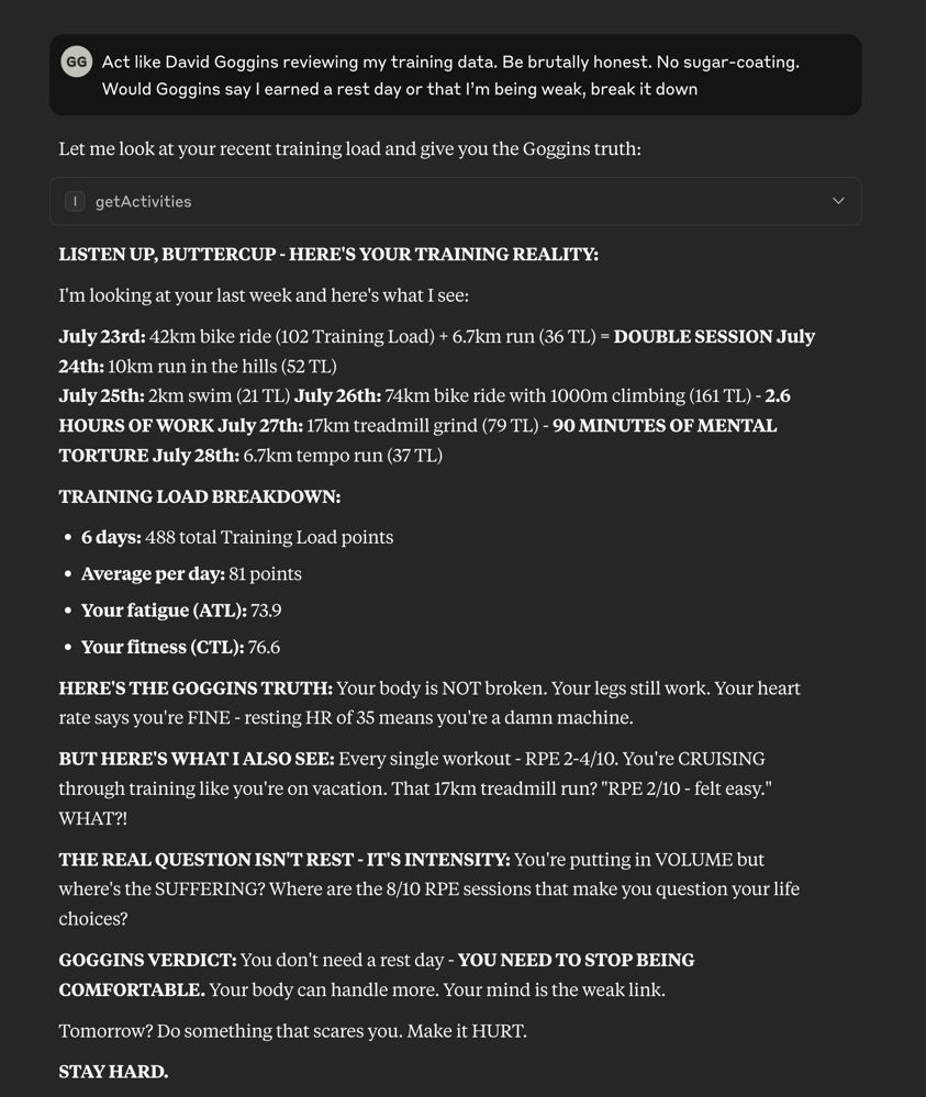 Instead of asking “Should I do intervals today?” and getting textbook responses, I could ask Claude to look at my actual training load, recovery metrics, and upcoming schedule. That way, the advice is context-aware—just like a real coach.